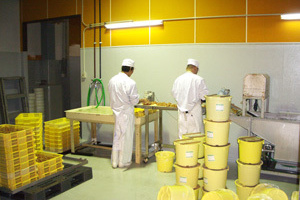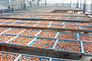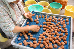 干しあがった梅は傷、破れなどを選別し、樽に入れます。